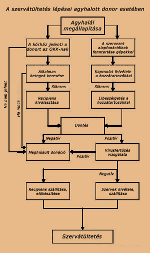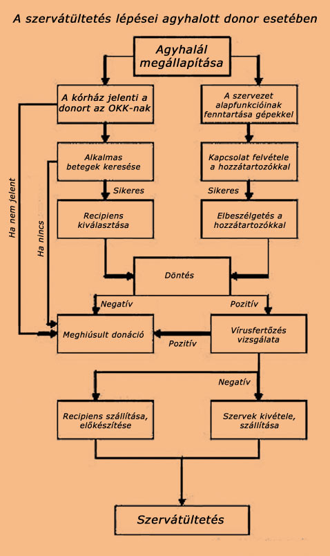 A donorjelentéstől a szervátültetésig 2007. január 1. óta az Országos Vérellátó Szolgálat Szervkoordinációs Irodájába fut be az ország egész területéről minden donorjelentés az erre a célra fenntartott telefonszámon. A donorjelentés folyamata során az ügyeletes országos koordinátor rögzíti a donor mindazon adatait, amely alapján megítélhető nagy valószínűséggel, hogy mely szervek kerülhetnek átültetésre. Ezután megtörténik a szervek felajánlása a beültető centrumok felé, ahol az ügyeletes centrum koordinátorral veszi fel az országos koordinátor a kapcsolatot. Máj-, szív- , hasnyálmirigy- és tüdőkivétel esetén a recipiens (szervre váró beteg) már a szervkivétel előtt kiválasztásra, behívásra és előkészítésre kerül a donor vércsoportja, testméretei és egyéb szakmai szempontok alapján. Az országos koordinátor ez idő alatt megszervezi és összehangolja a szervkivevő teamek utazását és érkezését a donort jelentő kórházba, szükség esetén újabb, a szervalkalmasság eldöntéséhez szükséges vizsgálatokat kér, megszervezi a vírusszerológiai vizsgálat, valamint kombinált szervbeültetési szándék estén az előzetes keresztpróba elvégzését. Emellett a Szervkoordinációs Iroda ügyeletese folyamatosan követi a donorgondozás menetét, amely a szervek alkalmasságát befolyásolja, szükség esetén egyeztet, tanácsokat ad az intenzív osztálynak. A szervkivétel során a szervkivevő csoportokat az OVSZ centrum koordinátora(i) kíséri(k). Az ő feladatuk a donort adó kórházban a donor kórlapja alapján az addigi adatok valódiságának vizsgálata, az agyhalál megállapítás törvény által előírt formai követelményeinek ellenőrzése, a daganatos vagy fertőző betegség átvitele megelőzésének érdekében kórelőzményben erre utaló adatok illetve vizsgálati eredmények áttekintése stb. A donortól származó (vér- és lép-) minták és a kivett szervek előírás szerinti jelölése, tárolása és szállítása szintén a kiutazó koordinátor feladata. A szervkivételt követően 8-10 órával elkészülő veseszelekciós lista érkezésekor a centrum koordinátorok részt vesznek a vesék allokációjában (centrumok közötti veseelosztás), a recipiensek kiválasztásában és behívásában, műtét előtti vizsgálataik lebonyolításában, műtéti előkészítésükben, követve az orvos utasításait. A szelekciós lista az országos várólista azon ad hoc szelektált része, mely a donor vércsoportjának és HLA antigénjeinek alapján 15-40 olyan recipiens nevét tartalmazza, akik az adott donor két veséjének egyikét jó eséllyel kaphatják. A listáról történő betegkiválasztást meghatározott szempontok szerint történik (donor és recipiens korának körülbelüli egyezése, gyerekek előnye, régen várók előnye, hiperimmunizáltak előnye, CMV szerológiai status egyezés, centrumok közötti egyensúly, veseküldés távolsága és ischaemiás idő kapcsolata stb.). Mihály Sándor |